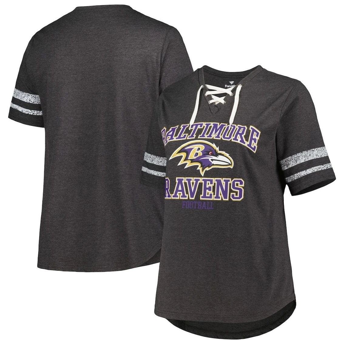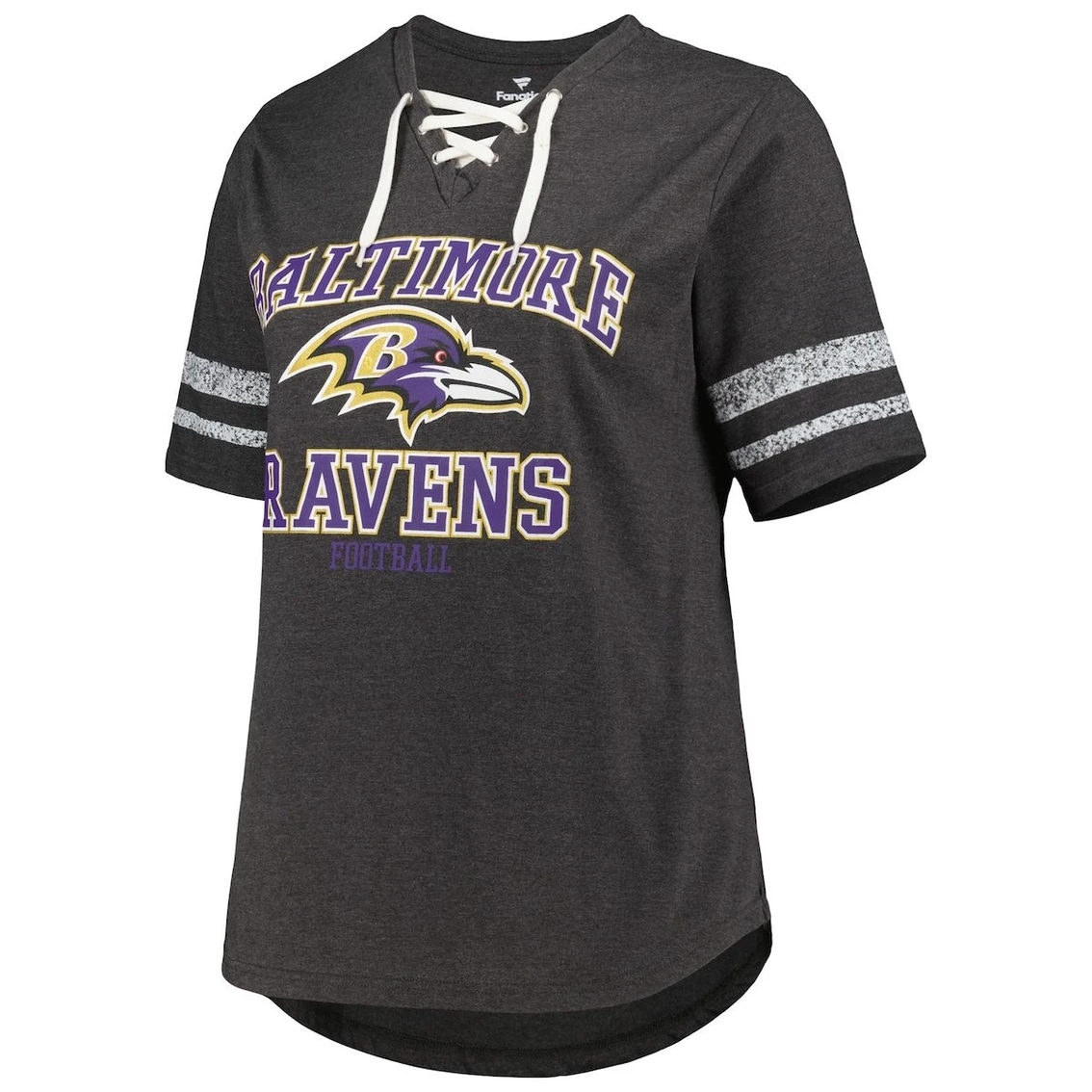 - This Fanatics Branded T-shirt is the perfect addition to your team gear. A lace-up V-neckline, vintage stripes and bold Baltimore Ravens graphics combine for a spirited look. A rounded hem adds a bit of extra coverage.