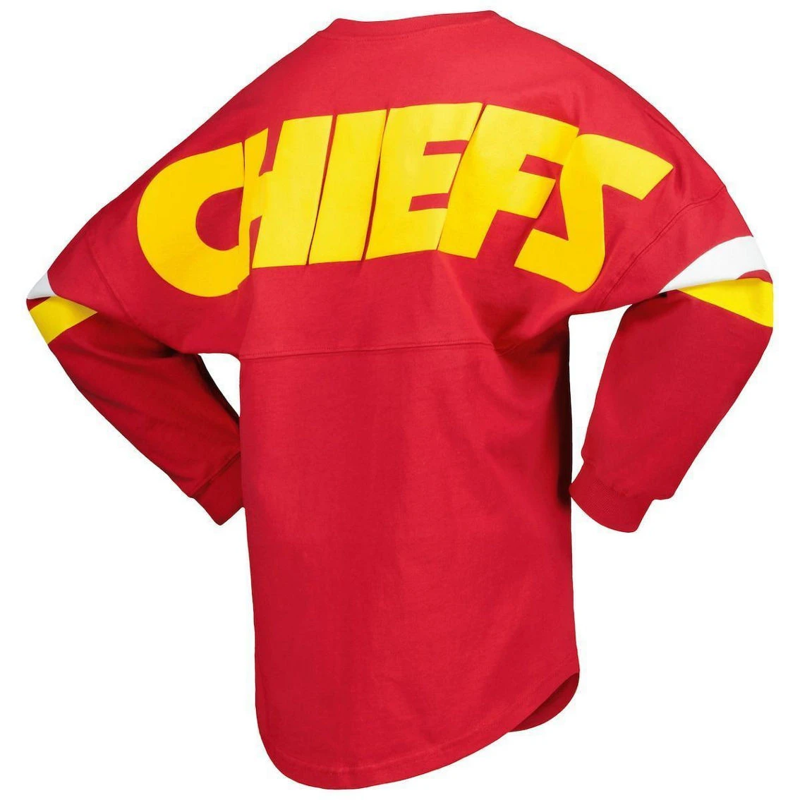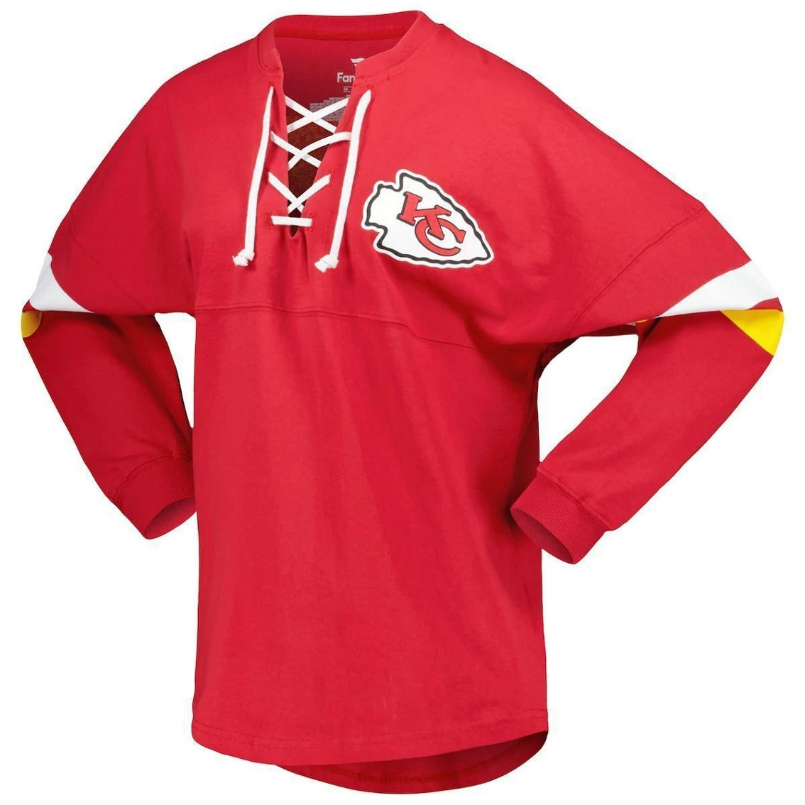 - Make a fashion statement on Kansas City Chiefs game day in this Spirit Jersey V-neck T-shirt from Fanatics Branded. It features a sporty lace-up neckline and stripes in team colors that highlight the Kansas City Chiefs graphics printed on the front and back. The longer, rounded hem also provides a more comfortable fit and feel.