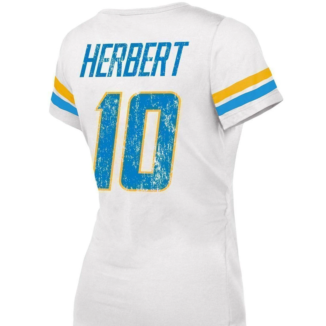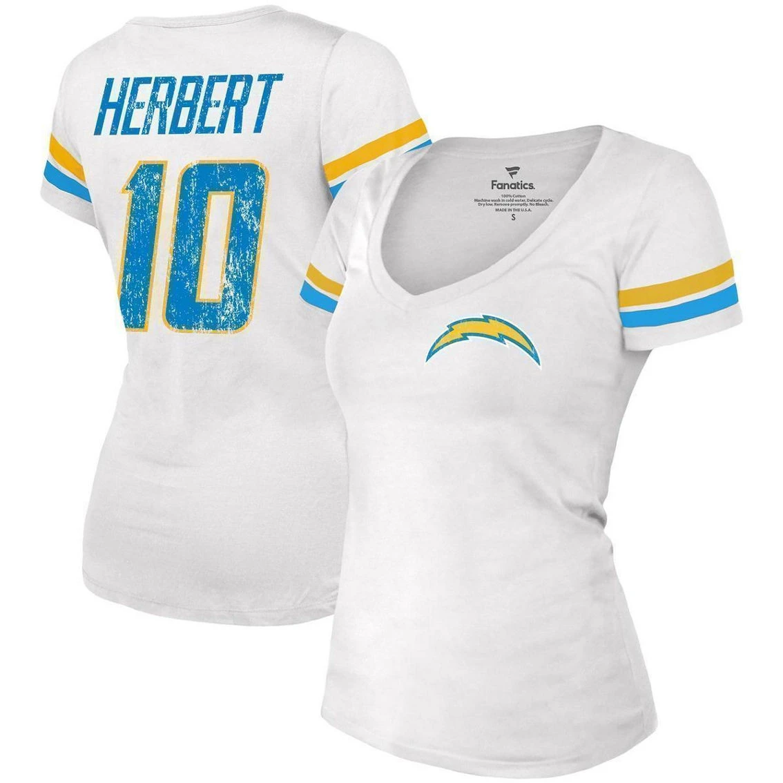 - Mix your Los Angeles Chargers wardrobe in the name of Justin Herbert with this Name & Number v-neck T-shirt. This top’s distressed details offer an edgy take on the iconic Los Angeles Chargers logo and a nod to Justin Herbert, complete with contrast color stripes to take your Los Angeles Chargers spirit to fashionable new heights.