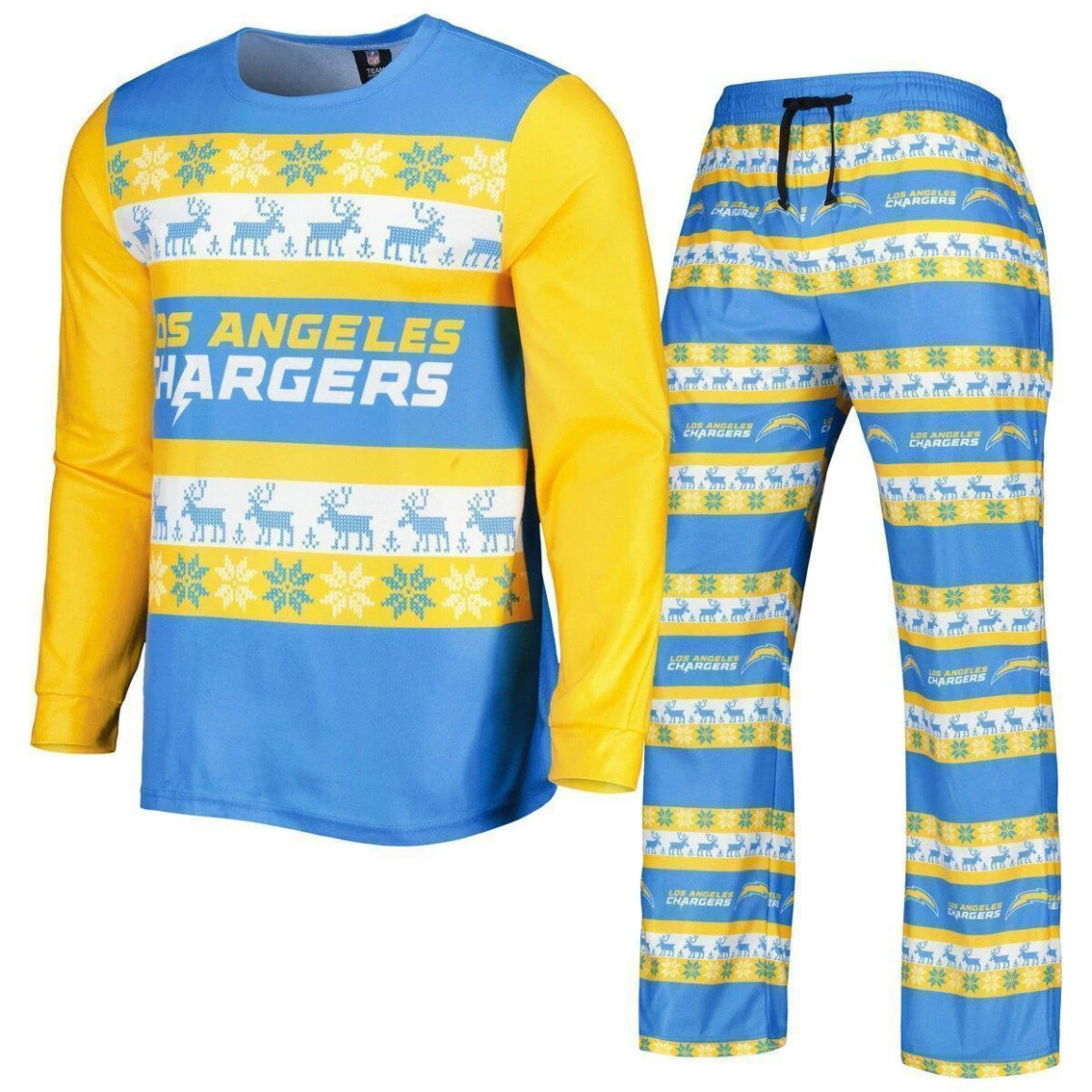 - Kick off the holiday season in this festive Los Angeles Chargers Ugly pajama set from FOCO. Its playful design features a whimsical pattern with authentic Los Angeles Chargers graphics and colors all over. The adjustable waistband will also provide a personalized fit for the most comfortable feel.
