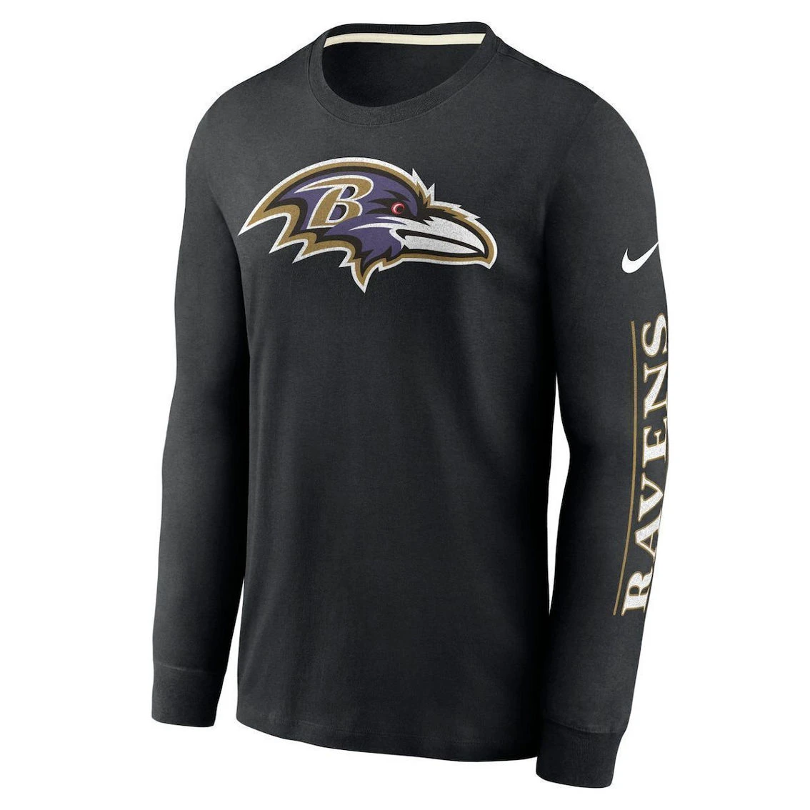 - Boost your collection of official Baltimore Ravens apparel with this Fashion T-shirt from Nike. It features a distressed team logo on the front, as well as their name spelled out across the sleeve in bold font. The long sleeves and blend of fabrics combine to give you the coziest Baltimore Ravens game day experience.