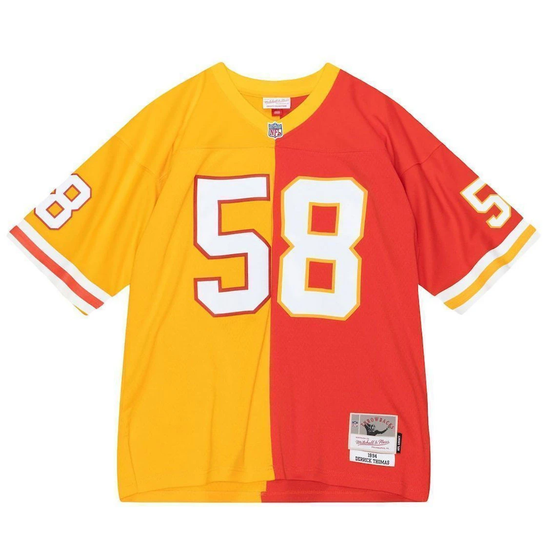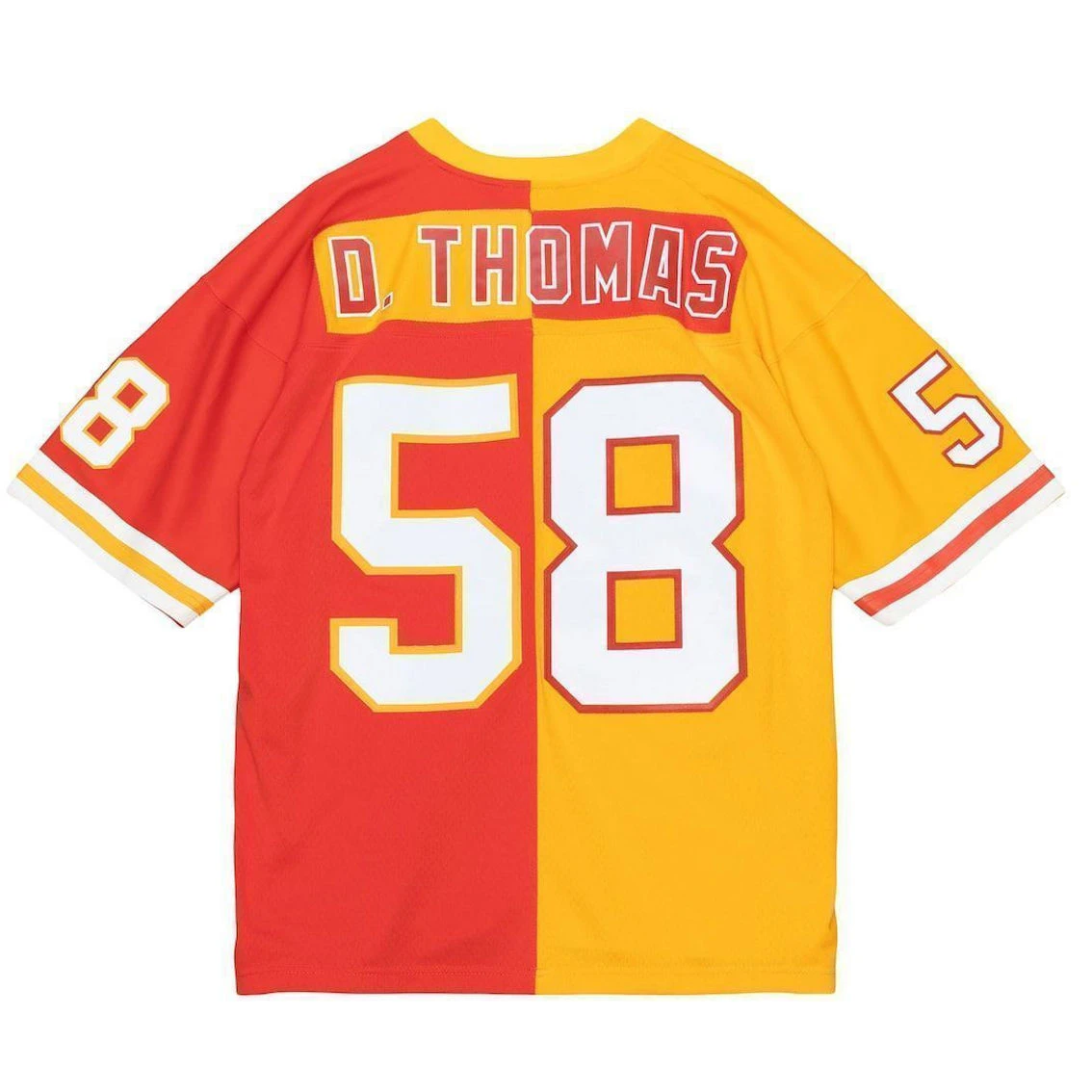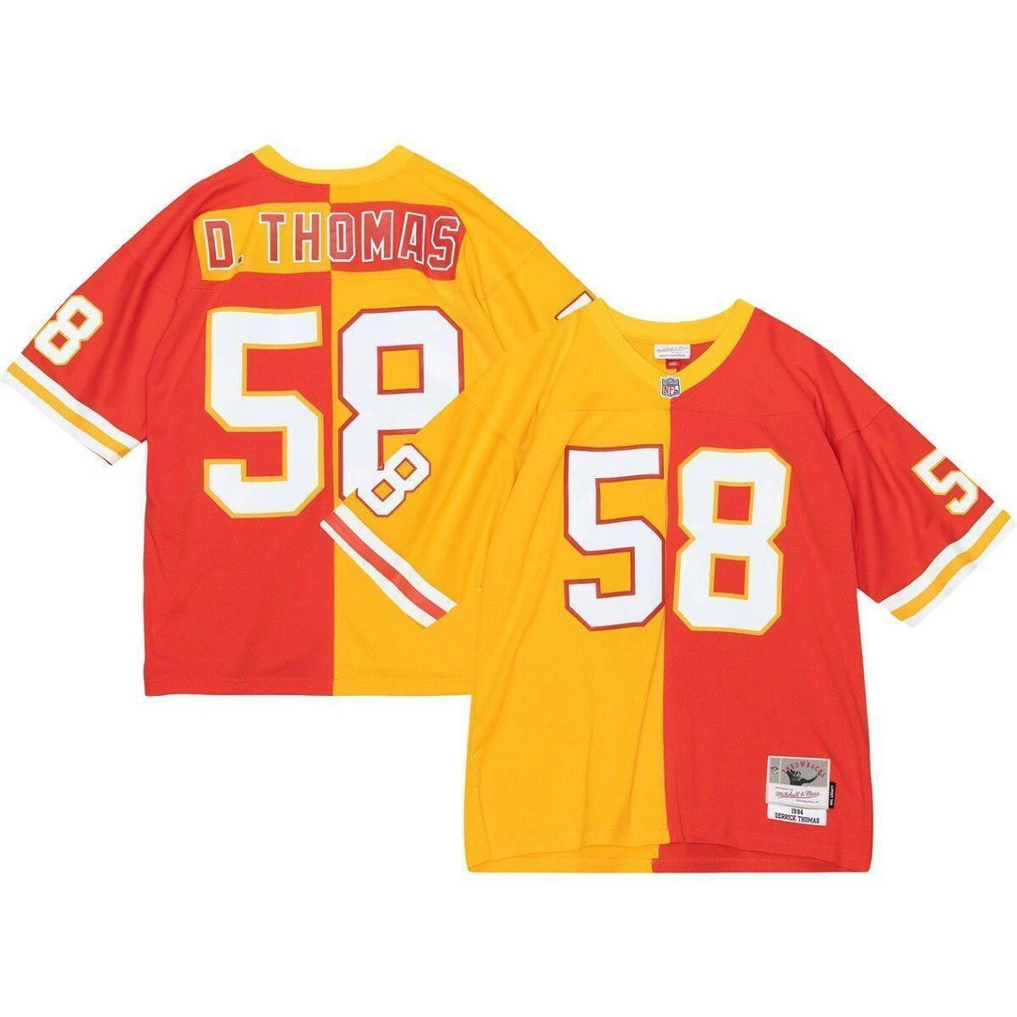- Showcase your love for one of the greatest players of all time in a fresh and unique way with this Derrick Thomas Split Legacy jersey from Mitchell & Ness. This contrasting Kansas City Chiefs jersey design features the name and number across multiple colors and trims, allowing you to boast your Derrick Thomas spirit loud and proud. Additionally, the lightweight design and droptail hem bring comfort to your Kansas City Chiefs game day gear.