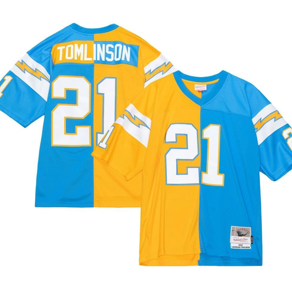 - Showcase your love for one of the greatest players of all time in a fresh and unique way with this LaDainian Tomlinson Split Legacy jersey from Mitchell & Ness. This contrasting Los Angeles Chargers jersey design features the name and number across multiple colors and trims, allowing you to boast your LaDainian Tomlinson spirit loud and proud. Additionally, the lightweight design and droptail hem bring comfort to your Los Angeles Chargers game day gear.