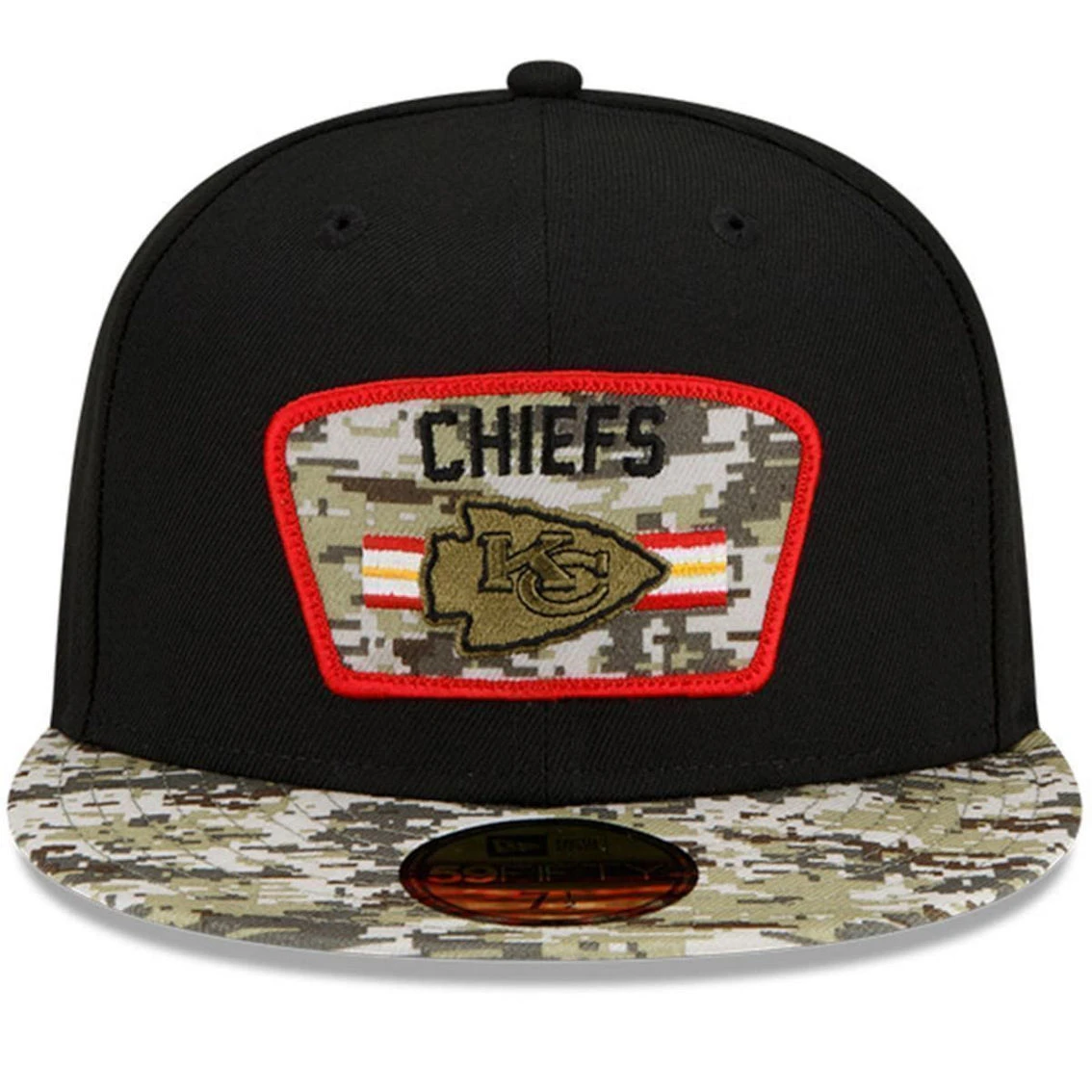 - Honor our service members while supporting your favorite team in this year’s Official NFL Salute To Service Collection. This two-tone 59FIFTY Fitted Hat is constructed of black polyester on the crown and a camo patterned polyester fabric on the visor. The front crown features a fabric applique with custom Kansas City Chiefs art. This patch uses the same camo fabric from the visor and is surrounded with contrasting team color embroidery. Finishing touches include an embroidered American flag patch on the right wear and the official NFL ”Salute to Service” patch on the rear. Join your favorite Kansas City Chiefs players as they wear this cap on the field during the month of November! The NFL does not profit from the sale of Salute to Service products. Charitable contributions are awarded by the NFL Foundation to the NFL’s military nonprofit partners. For more information, please visit www.NFL.com/causes/salute.