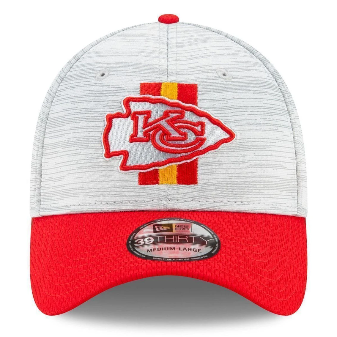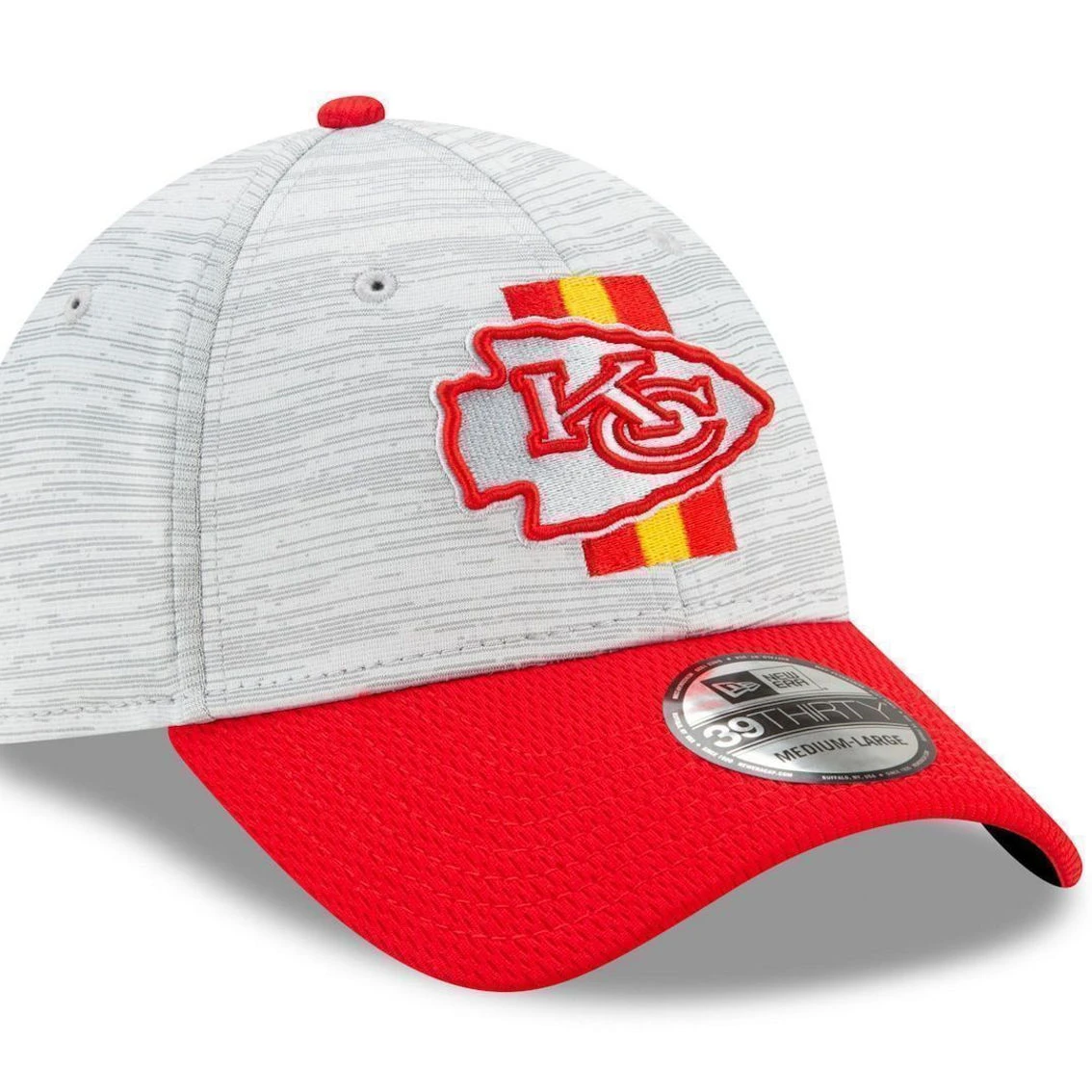 - New year, new goals. Start this summer and season off in style with the Official Training Camp Collection from New Era. This two tone Kansas City Chiefs 39THIRTY stretch fit is constructed of grey Digi-Tech heather performance fabric with team color Dash Mark fabric on the visor. On the front crown an embroidered grey and team color logo is complimented by a uniform inspired pattern. Get ready for Kansas City Chiefs Training Camp today!