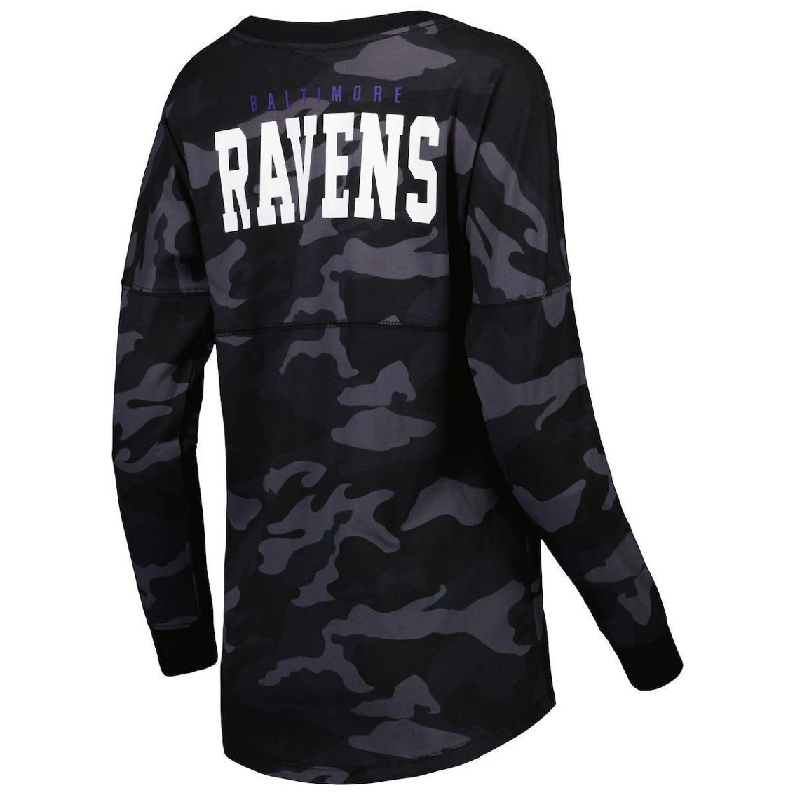 SKU: DSCO1151839951 Category: Baltimore Ravens Tags: Clothing & Accessories, New Era Women's Black Baltimore Ravens Camo Long Sleeve T-Shirt, T-Shirts