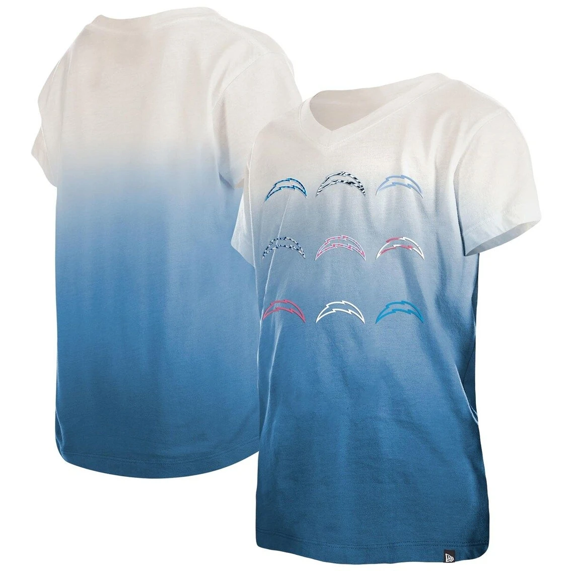 - If your kiddo’s favorite team is the Los Angeles Chargers, then be sure to pick up this Multi Logo T-shirt from New Era. It features nine team logos across the front that come in multiple different designs and colors, giving this tee a one-of-a-kind look. The stylish V-neck and ombre design are sure to make this a staple in your young fan’s Los Angeles Chargers game day rotation.