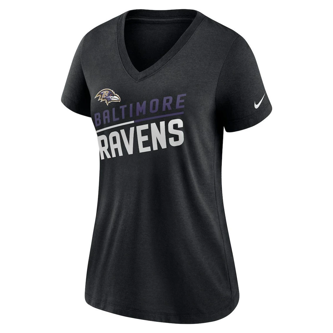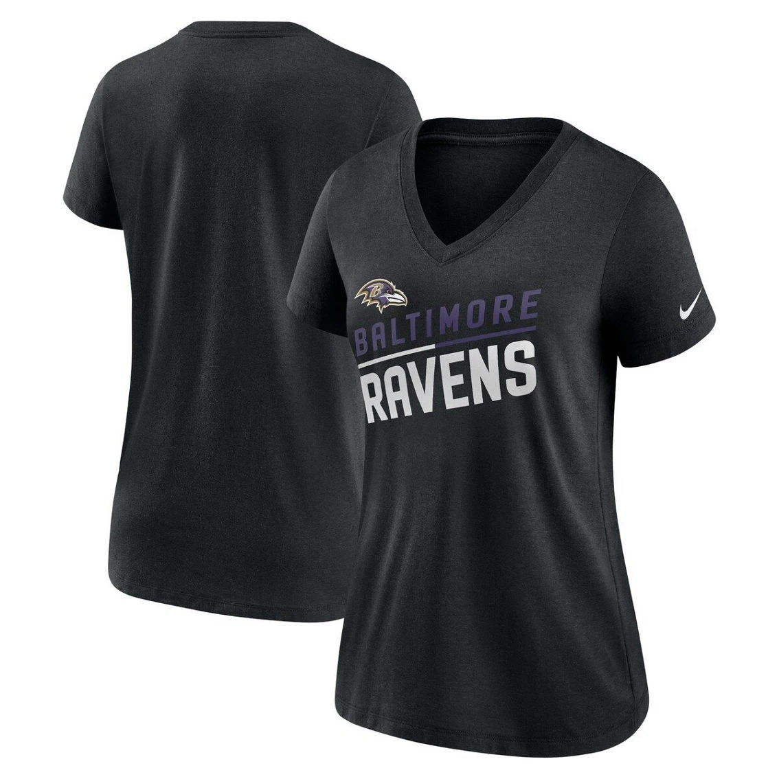 - Ensure everyone knows who you want to see win on game day by wearing this Baltimore Ravens V-neck T-shirt from Nike. It features the team name in a slanted design printed below the Baltimore Ravens logo. Plus, tri-blend material gives this tee an extra-soft feel for added comfort.