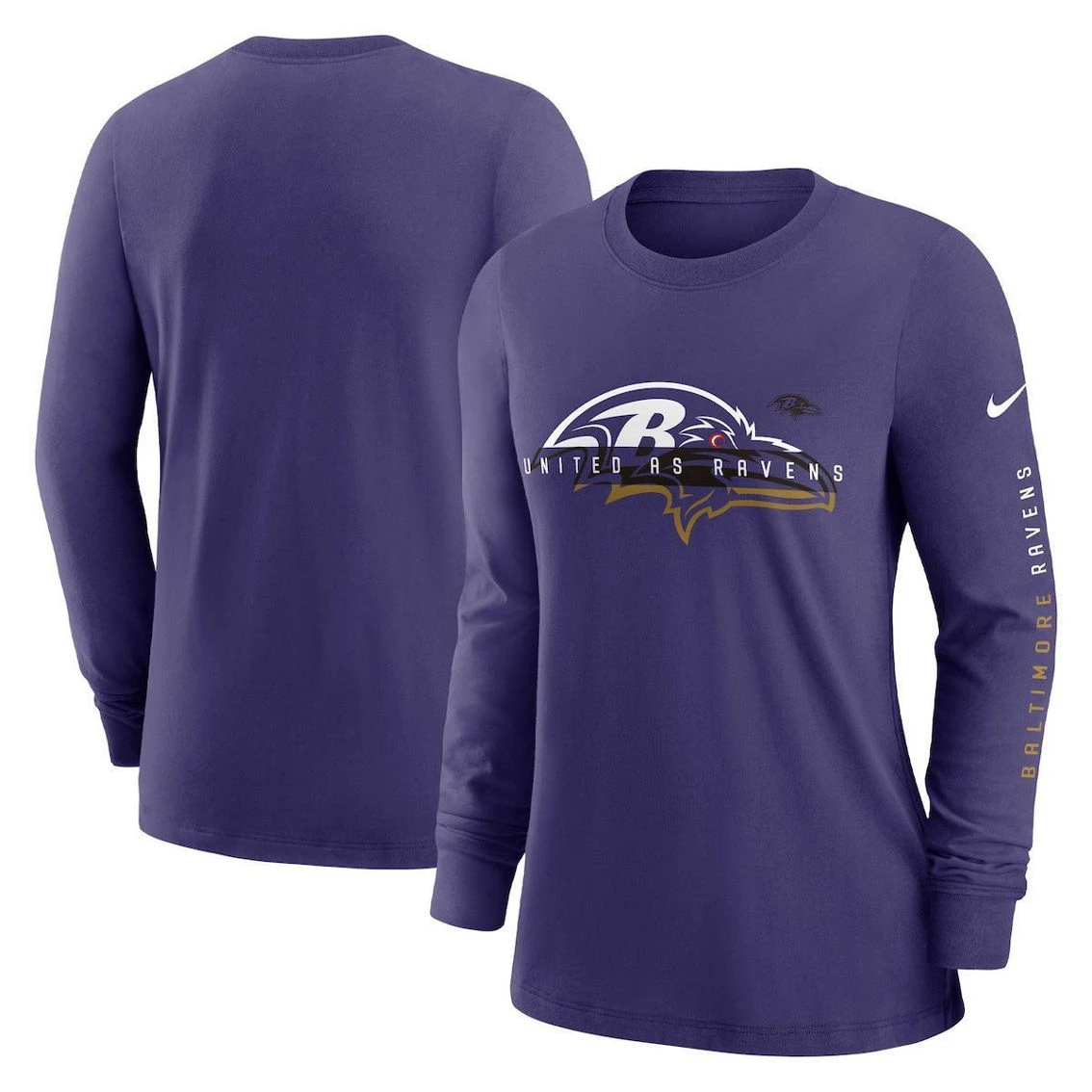 - Stave off chilly weather with a spirited display of your Baltimore Ravens pride in this Prime Split T-shirt from Nike. It features striking Baltimore Ravens graphics on the chest and sleeve that leave no doubt about your devotion to the squad. Plus, cozy long sleeves and a classic design make it perfect to pair with your other cool-weather gear.
