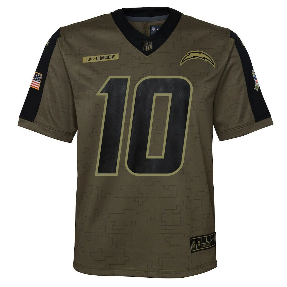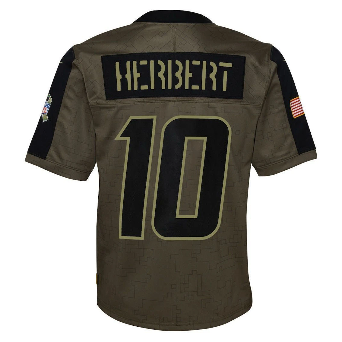 - This Justin Herbert Los Angeles Chargers 2021 Salute To Service Game Jersey is a spirited piece for your kiddo to have in their collection. It features crisp Los Angeles Chargers graphics, a linear camo-like pattern, an American flag patch on one sleeve, and a camouflage ribbon patch on the other. Ensure your youngster has a bold look to show of their Los Angeles Chargers pride by grabbing them this Nike gear. The NFL does not profit from the sale of Salute to Service products. Charitable contributions are awarded by the NFL Foundation to the NFL’s military nonprofit partners. For more information, please visit www.NFL.com/causes/salute.