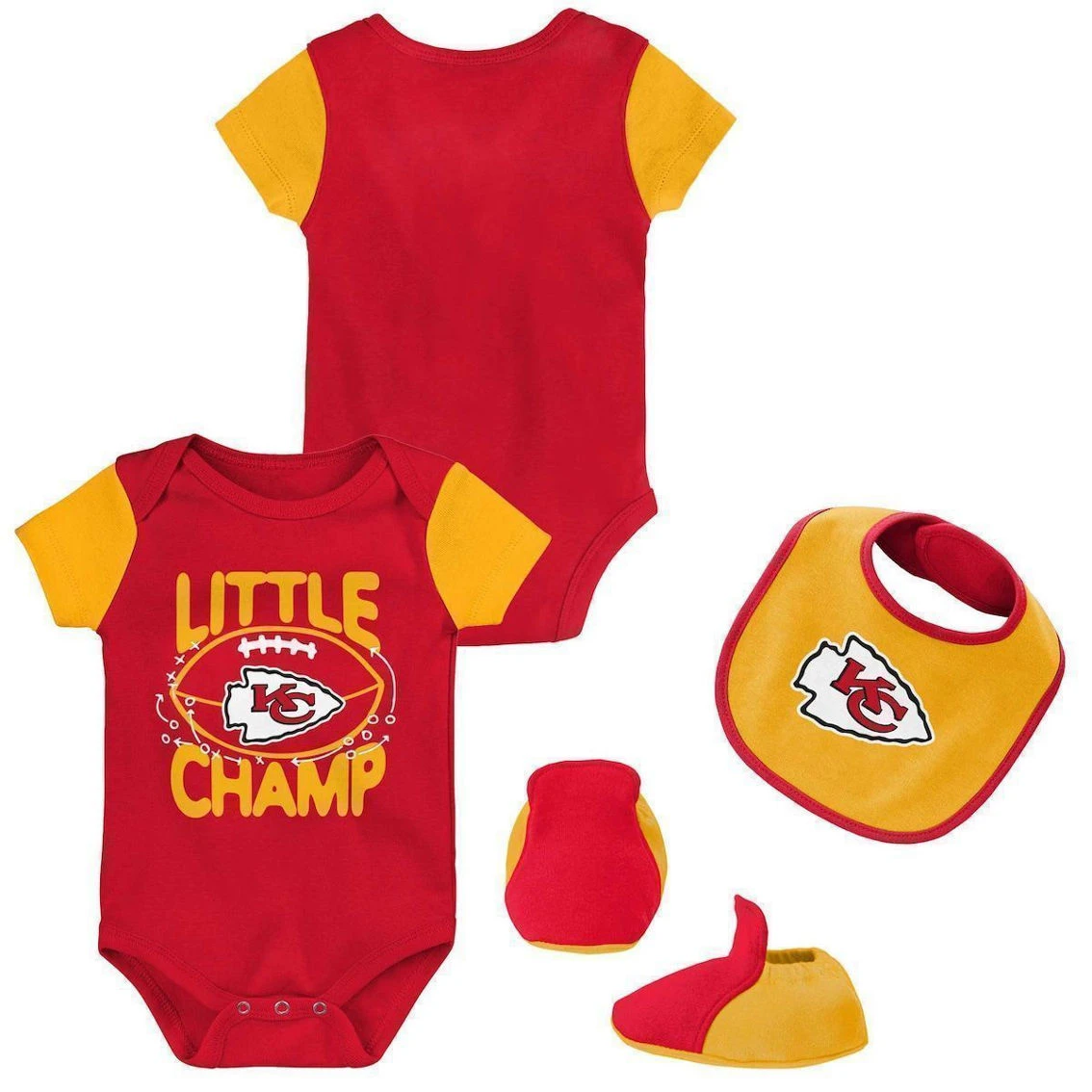- Let your little champ show off their blossoming Kansas City Chiefs fandom in this adorable set. The bodysuit and bib feature vibrant Kansas City Chiefs graphics as well as adjustable closures for easy accessibility. Pair them with the matching booties and you’ll get the perfect outfit for your tiny bundle of joy.