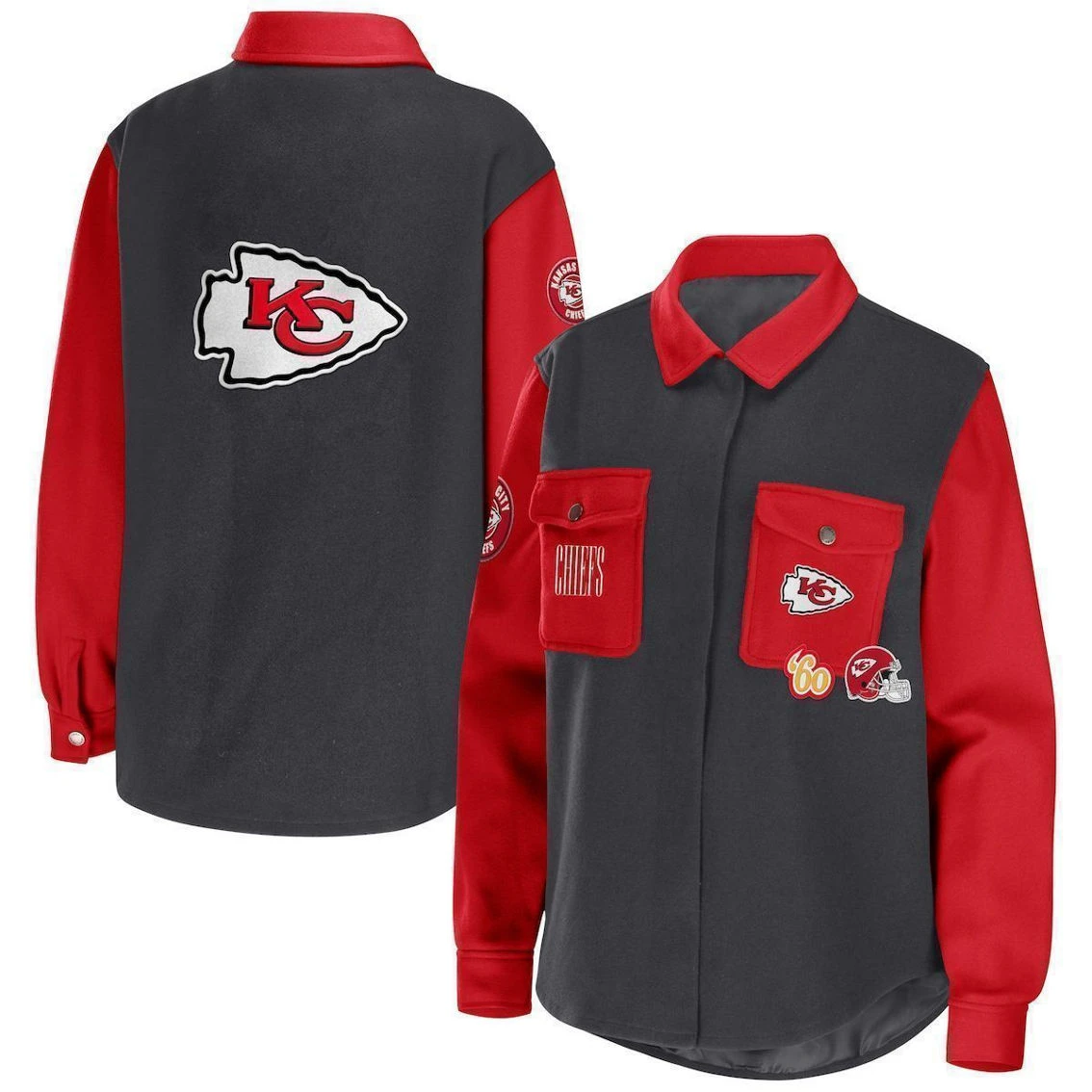 - Add a unique finish to any Kansas City Chiefs look with this WEAR by Erin Andrews jacket. It features eye-catching team patches and two buttoned chest pockets to store any essentials. When the weather cools, stay warm in Kansas City Chiefs style with this fun top.