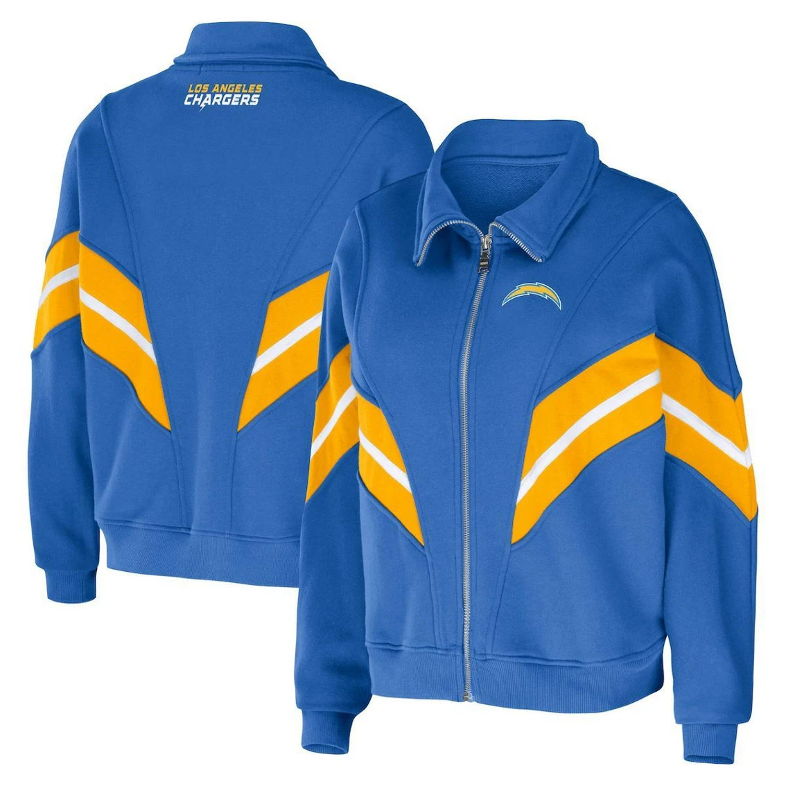 - Don’t let cooler temperatures stop you from cheering for your Los Angeles Chargers when you have this WEAR by Erin Andrews Yarn Dye Stripe jacket in your wardrobe. Authentic team graphics and contrast-color stripes let everyone know who you root for on game day. The full-zip closure also gives you the option of a full-fledged layered look or leaving it unzipped to reveal your favorite Los Angeles Chargers tee beneath.