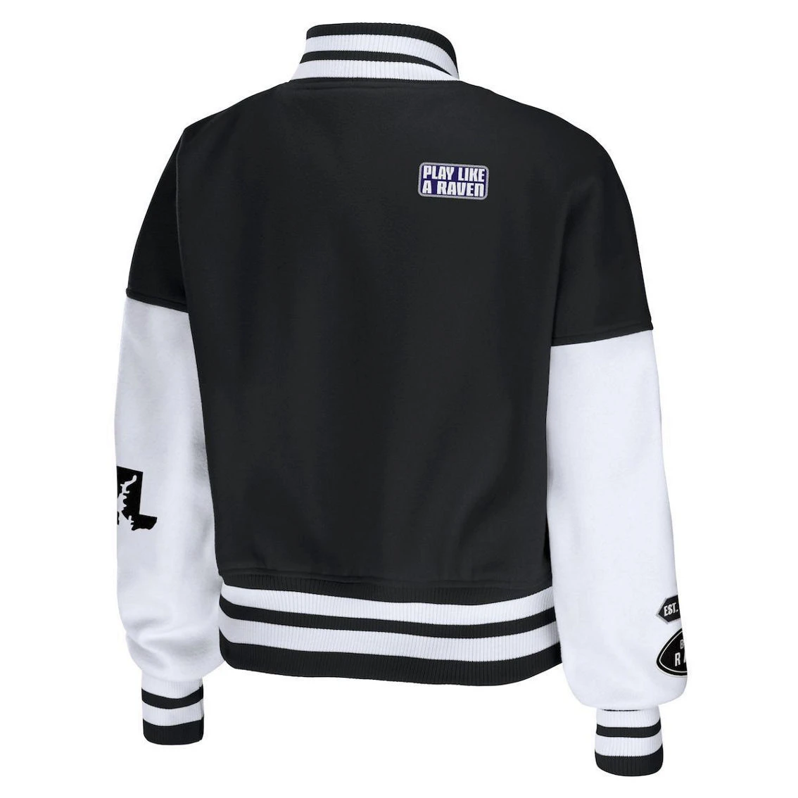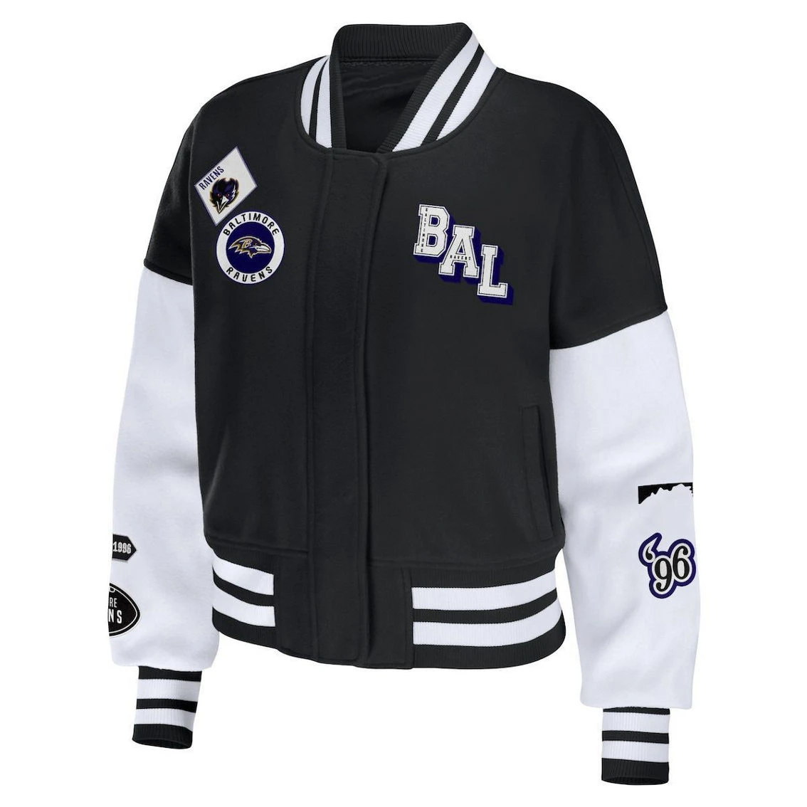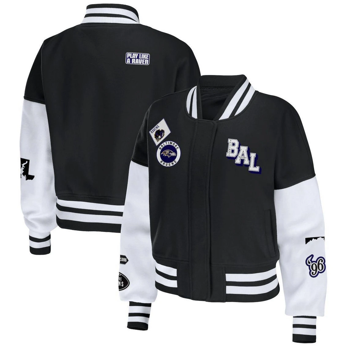 - Put your Baltimore Ravens pride on full display with this Varsity jacket from WEAR by Erin Andrews. The full-zip front allows you to wear it open or closed, while the dropped shoulders offer extra room for flexibility. Best of all, the striking Baltimore Ravens design with eye-catching patches boasts your team spirit in an authentic fashion.